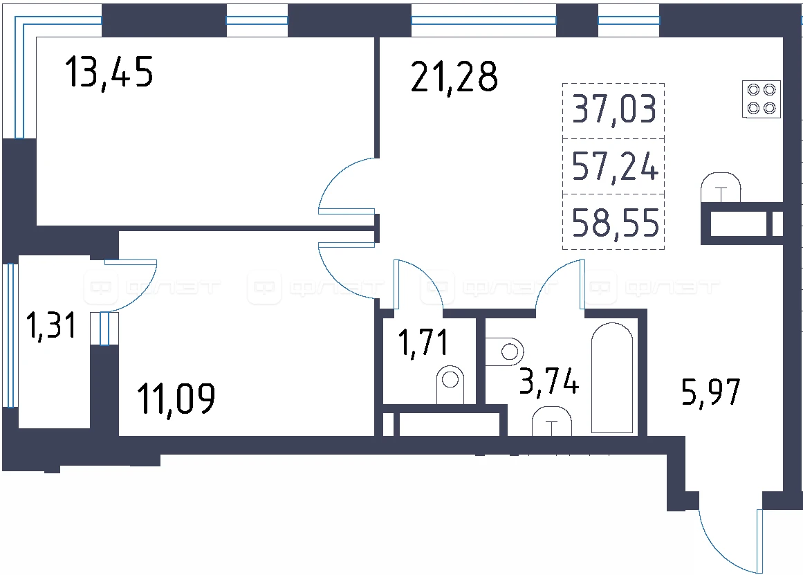 - 58.55/37.03/8.79 м²